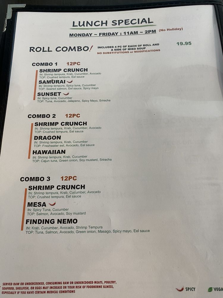 In: Krab, cucumber, avocado Top: Bay scallop, langostino, krab, green onions, masago, spicy mayo, eel sauce