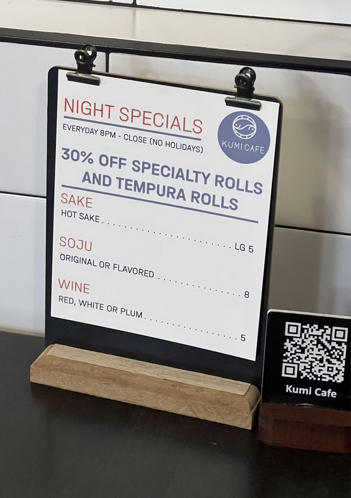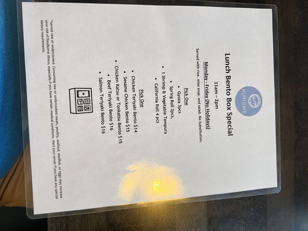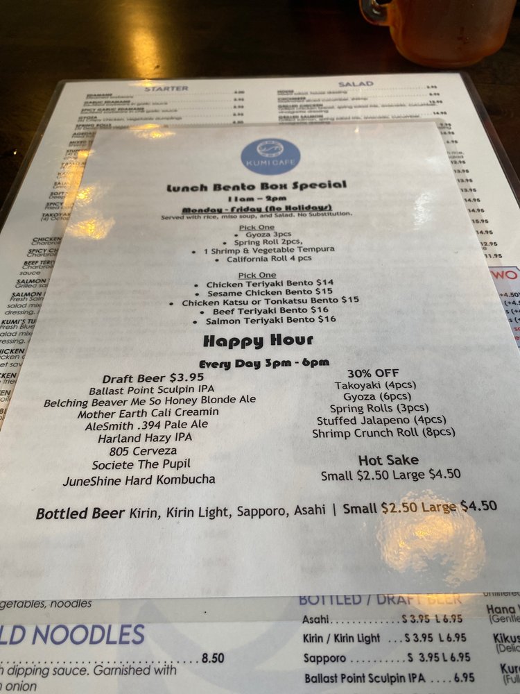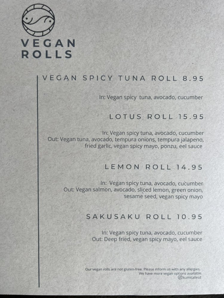 KUMI Sushi Grill offers a trendy yet casual dining experience in San Diego. With a diverse menu ranging from starters like edamame and gyoza to sashimi and carpaccio options, there's something for everyone. The restaurant prides itself on offering soy-free, vegan, and vegetarian options, catering to various dietary preferences. Customers have praised the friendly service and fresh, delicious food, with standout dishes like the mixed tempura bento box and the rainbow roll. The ambiance is clean and welcoming, making it a great spot for lunch or dinner. Overall, KUMI Sushi Grill stands out for its flavorful dishes, attentive staff, and vibrant atmosphere.