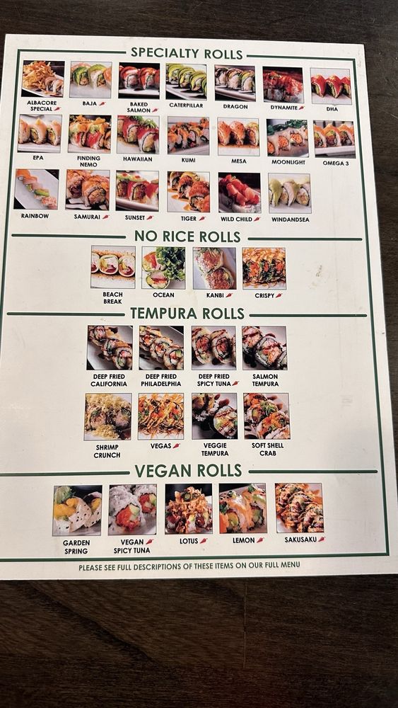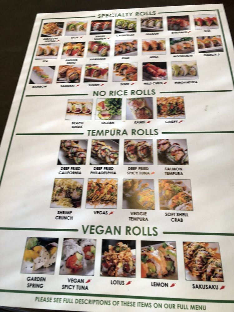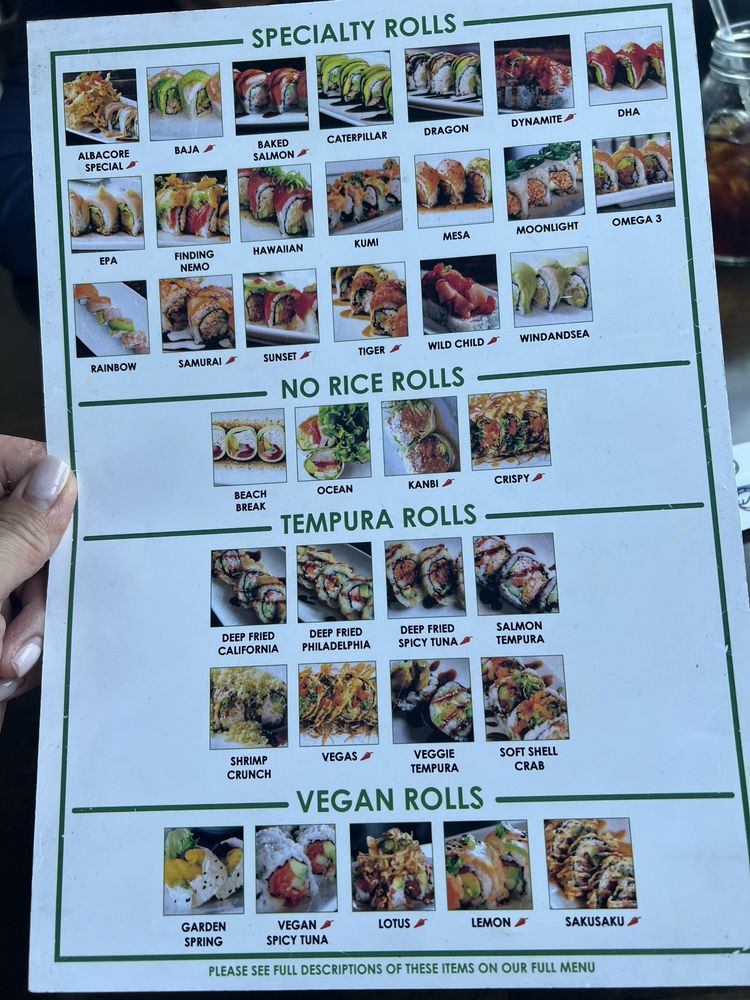 In: spicy tuna, shrimp tempura, cucumber top: albacore, tempura onions, ponzu, spicy mayo, eel sauce, green onion.